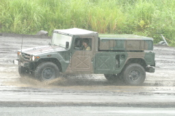 こんな天候では当然航空支援のF−2は省略 いわゆるやったつもりの爆撃のみ実施。 特科火力 82式指揮通信車。 |