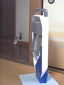 | ようやく完成しました。 先端部とグリップ部を最初作る気がなかったんで材料不足になり紙も多数使用してありますが、当初予定していたよりも強度があり、180mmキャノンの台座としての使用に耐えるのではないかと思います。 ただしグリップは設計ミスです、妙なベクトルでグリップ部を支点に上部が体から離れる力が掛かっています。 感想としては 完成したシールドは全長80cmと以外に大きなものが出来上がってしまった・・・。 2002,10,26 米兵人 |