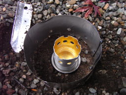 寒すぎるせいか風が強いせいか 気がつくと火が消えてしまいます 数回のテストを行い アルコールを側面の穴のちょっと下までの一杯一杯まで入れて点火して1〜2分そのまま燃焼させ十分にアルコールが温まり燃焼が強くなってからシェラカップを乗せて燃焼されると成功し 13分ほどかけて90℃超えました。 寒いのでお湯は梅昆布茶にして飲みました。 |